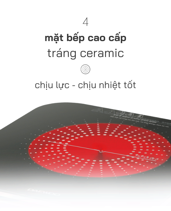 Bếp hồng ngoại Daewoo DWI-2215B có mặt bếp cao cấp tráng ceramic chịu lực, chịu nhiệt tốt, không chỉ mang lại vẻ ngoài sang trọng, tinh tế mà còn dễ dàng vệ sinh sau khi sử dụng. Bề mặt sáng bóng giúp bạn dễ dàng lau chùi và duy trì vẻ đẹp của bếp lâu dài.