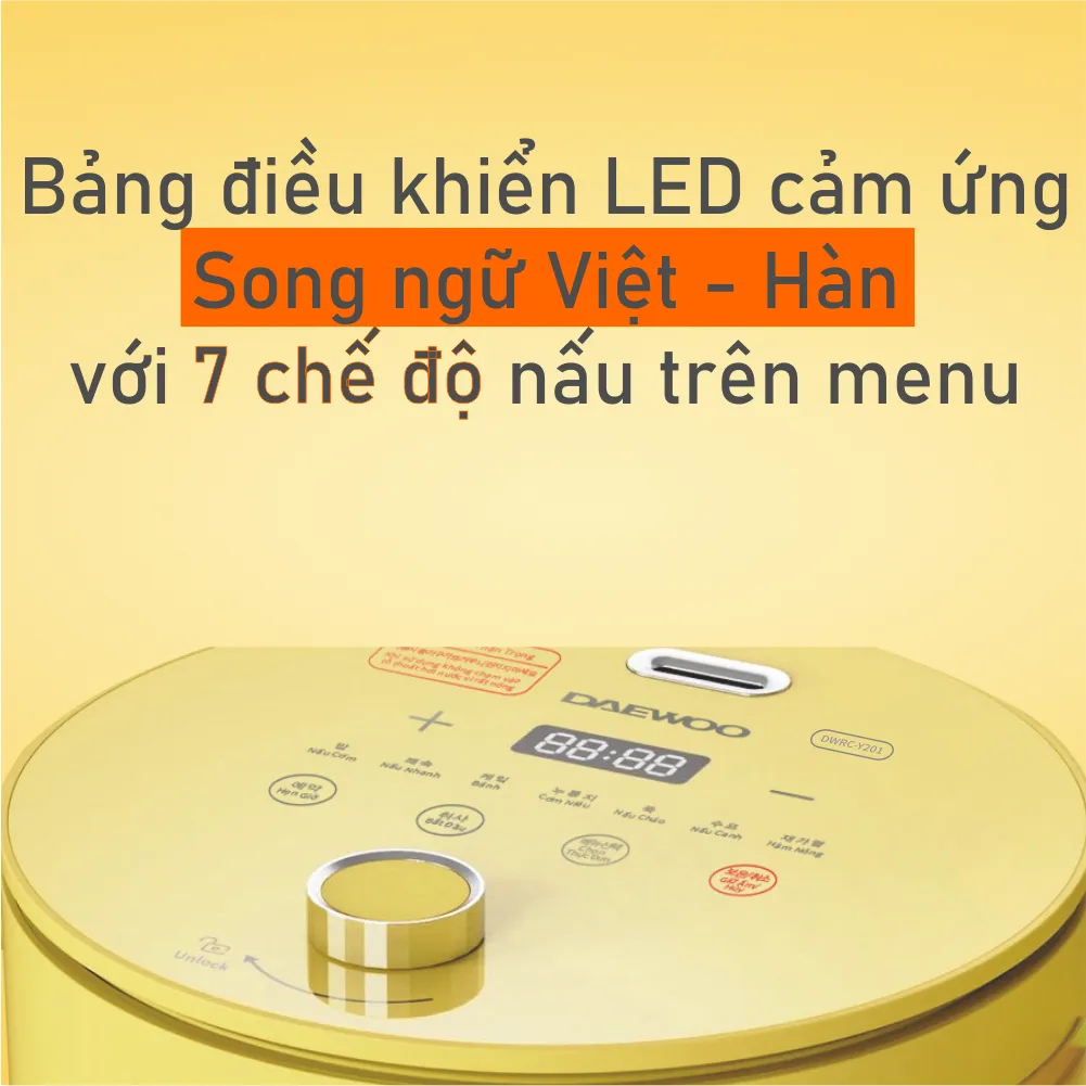 Nồi cơm điện Daewoo DWRC-Y201 được trang bị 7 chế độ nấu trên menu, cho phép bạn lựa chọn chế độ nấu cơm phù hợp với loại gạo và sở thích của gia đình. Các chế độ này giúp cơm chín đều, không bị nhão hay cháy, mang đến bữa ăn ngon miệng.